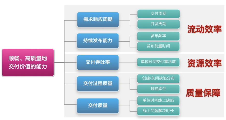 阿里巴巴研发效能度量体系,通过五个维度来度量团队是否具备了「顺畅、高质量交付价值的能力」,通过以上五组指标,从流动效率、资源效率和质量三个方面讲述了一个完整的故事,回答了目前组织持续交付价值的能力如何这个核心问题。其中,持续发布能力和需求响应周期这两组指标反映价值的流动效率;吞吐率反映资源效率;交付过程质量和对外交付质量这两组指标共同反映质量水平。