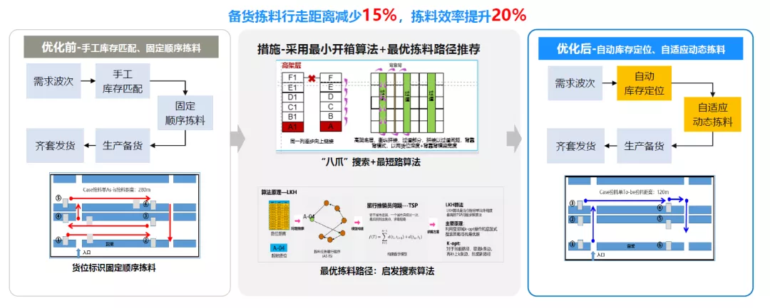 赵娜举例了一个最简单的案例——最优拣料路径算法。之前作业人员根据系统下放的拣料任务,按照任务顺序去做备货拣料,但只是有经验的作业人员知道如何精简,什么路径是最快速的,即便单据中货物的即便顺序繁杂。