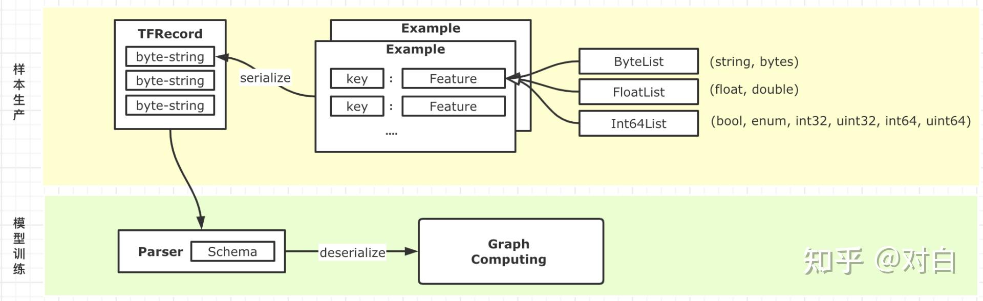 因此我们可以看出来,TFRecord并不是一个self-describing的格式,也就是说,tfrecord的write和read都需要额外指明schema。从上图我们也能看出来,在实际训练的时候,样本都需要经过一个知晓了Schema的Parser来进行解析,然后才能传递给Tensorflow进行实际的训练。