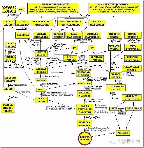代数——名称上研究的似乎是数,在我看来,主要研究的是运算规则。一门代数, 其实都是从某种具体的运算体系中抽象出一些基本规则,建立一个公理体系,然后在这基础上进行研究。一个集合再加上一套运算规则,就构成一个代数结构。在主要的代数结构中,最简单的是群(Group)——它只有一种符合结合率的可逆运算,通常叫“乘法”。如果,这种运算也符合交换率,那么就叫阿贝尔群 (Abelian Group)。如果有两种运算,一种叫加法,满足交换率和结合率,一种叫乘法,满足结合率,它们之间满足分配率,这种丰富一点的结构叫做环(Ring), 如果环上的乘法满足交换率,就叫可交换环(Commutative Ring)。如果,一个环的加法和乘法具有了所有的良好性质,那么就成为一个域(Field)。基于域,我们可以建立一种新的结构,能进行加法和数乘,就构成了线性代数(Linear algebra)。