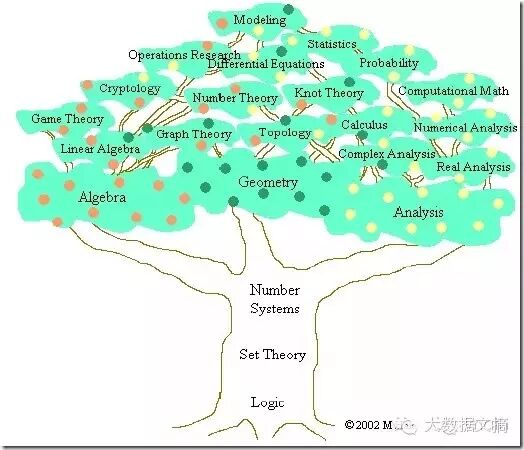 在集合论的基础上,现代数学有两大家族:分析(Analysis)和代数(Algebra)。至于其它的,比如几何和概率论,在古典数学时代,它们是和代数并列的,但是它们的现代版本则基本是建立在分析或者代数的基础上,因此从现代意义说,它们和分析与代数并不是平行的关系。