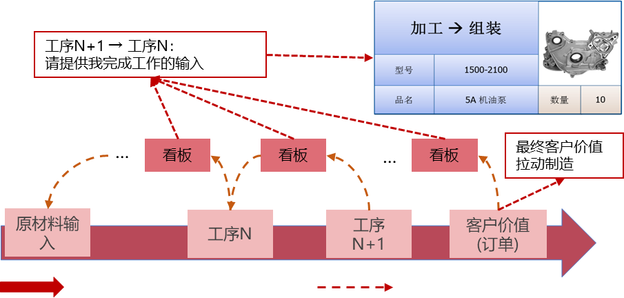 一词来自日文,指可视化卡片,源自精益制造,从丰田公司实践中演化出来。看板上每列为产品的每道工序,在后道工序在需要时,通过看板向前道工序发出信号——请给我需要数量的输入,前道工序只有得到看板后,才按需生产。看板信号由下游向上游传递,拉动上游的生产活动,使产品向下游流动。拉动的源头是最下游的客户价值,也就是客户订单或需求。