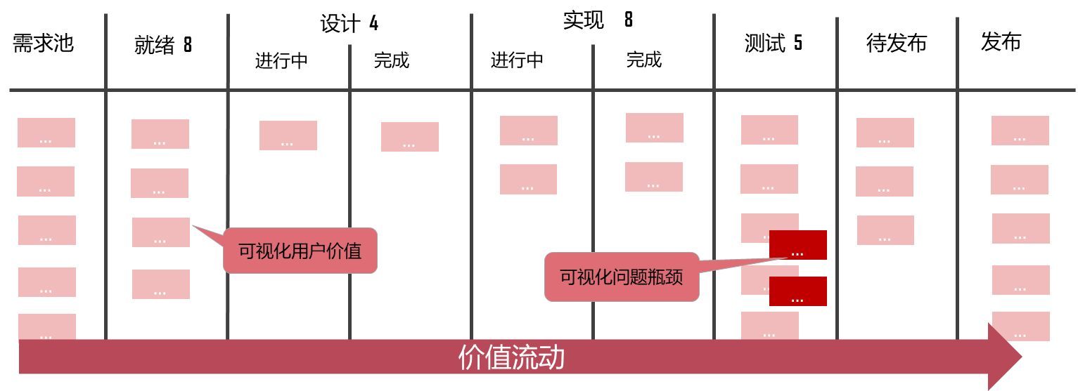 除了限制正在进行的工作外,看板可以让团队以更直观的方式监管、实测及记载工作流的每个阶段。通过看板可以清楚看到工作流中的瓶颈,这样就可以识别出效率低下的地方。如上图中的“测试”状态出现了任务积压,形成了瓶颈,影响了流动,是目前急需解决的问题。