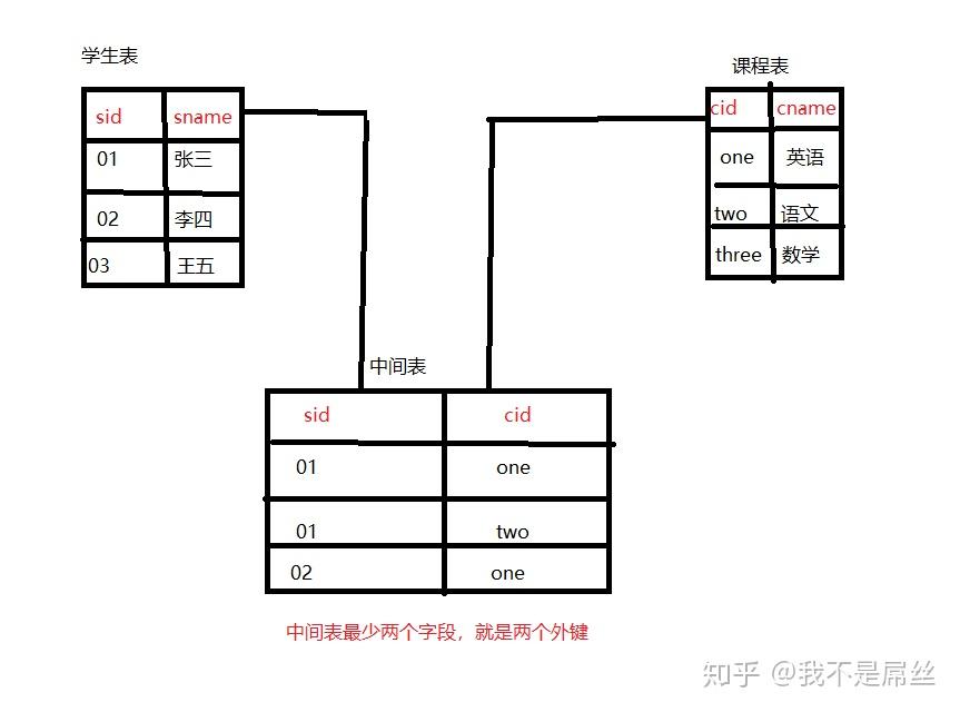 以学生和课程做例子(一个学生可以选多门课程,一个课程可以被多名学生选)