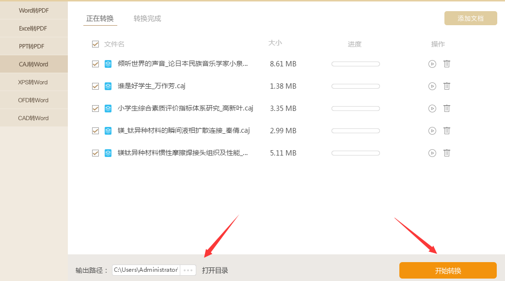 将所有需要转换的CAJ文件全选后拖到转换页面后,设置输出路径并点击开始转换即可;转换后的文档可以直接点击打开目录查看或在转换完成中右击打开。
