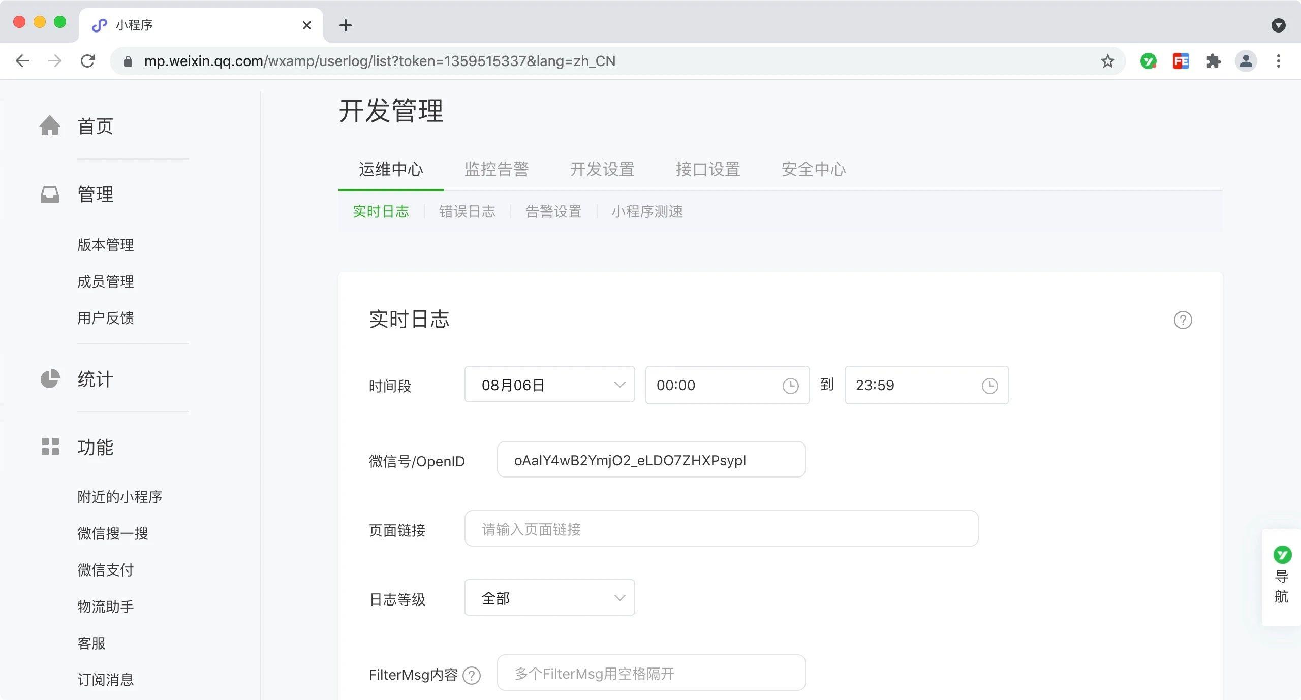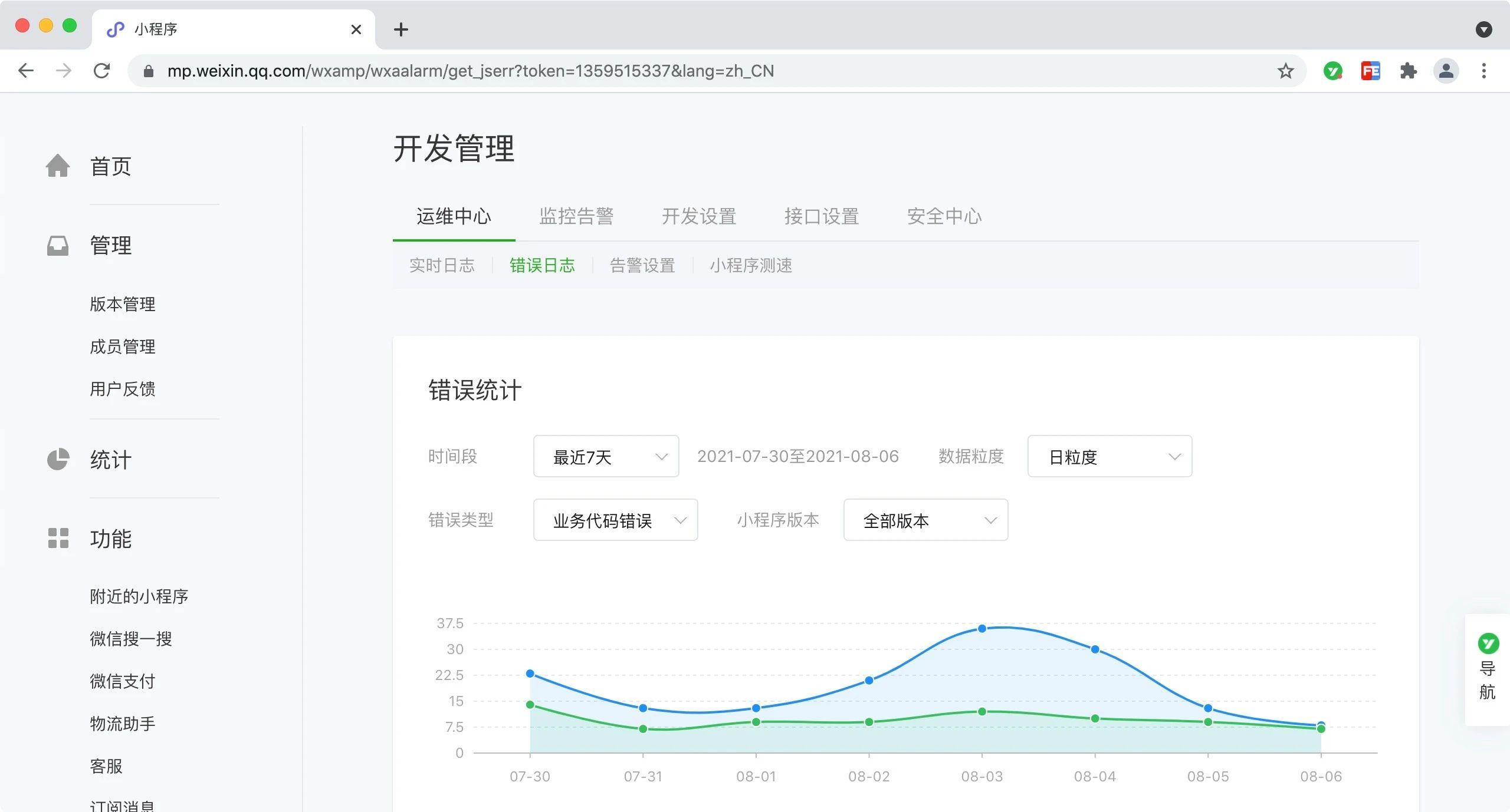 这几天我一直在观察我最早开发第一个答题小程序的mp后台界面,的开发-开发管理-报错信息