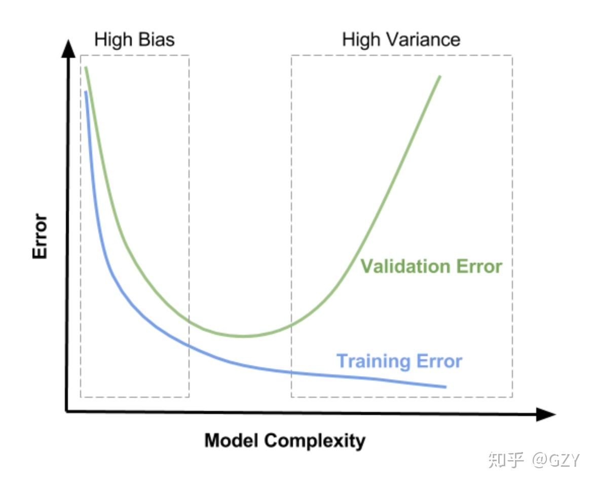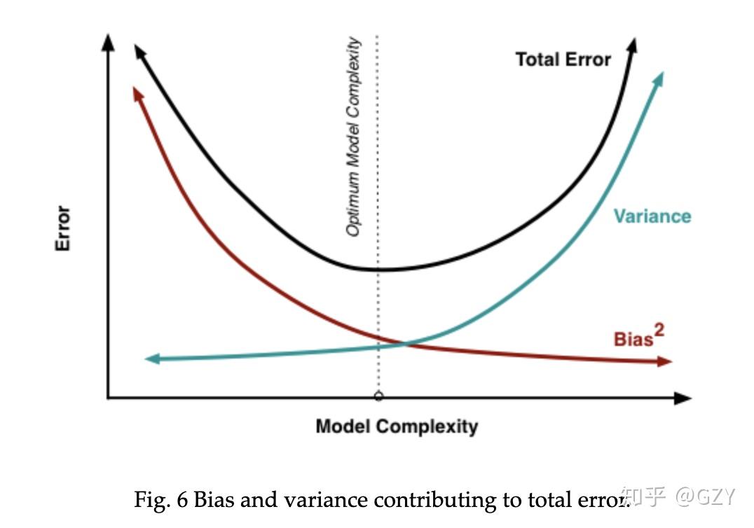 由此可见,模型的总体误差随着模型的复杂度的上升先下降后上升,偏差一直下降,在经过最优点后,下降趋势变缓;方差缓慢上升,但经过最优点后,大幅度上升。模型复杂度较低时【偏差大、方差小】,可以认为是一种欠拟合现象,模型复杂度较高时【偏差小、方差大】,可以认为是一种过拟合现象。而最优点【偏差小、方差小】是一种理想情况,因此我们需要合理的权衡偏差和方差的关系,找到尽可能优的模型结构。