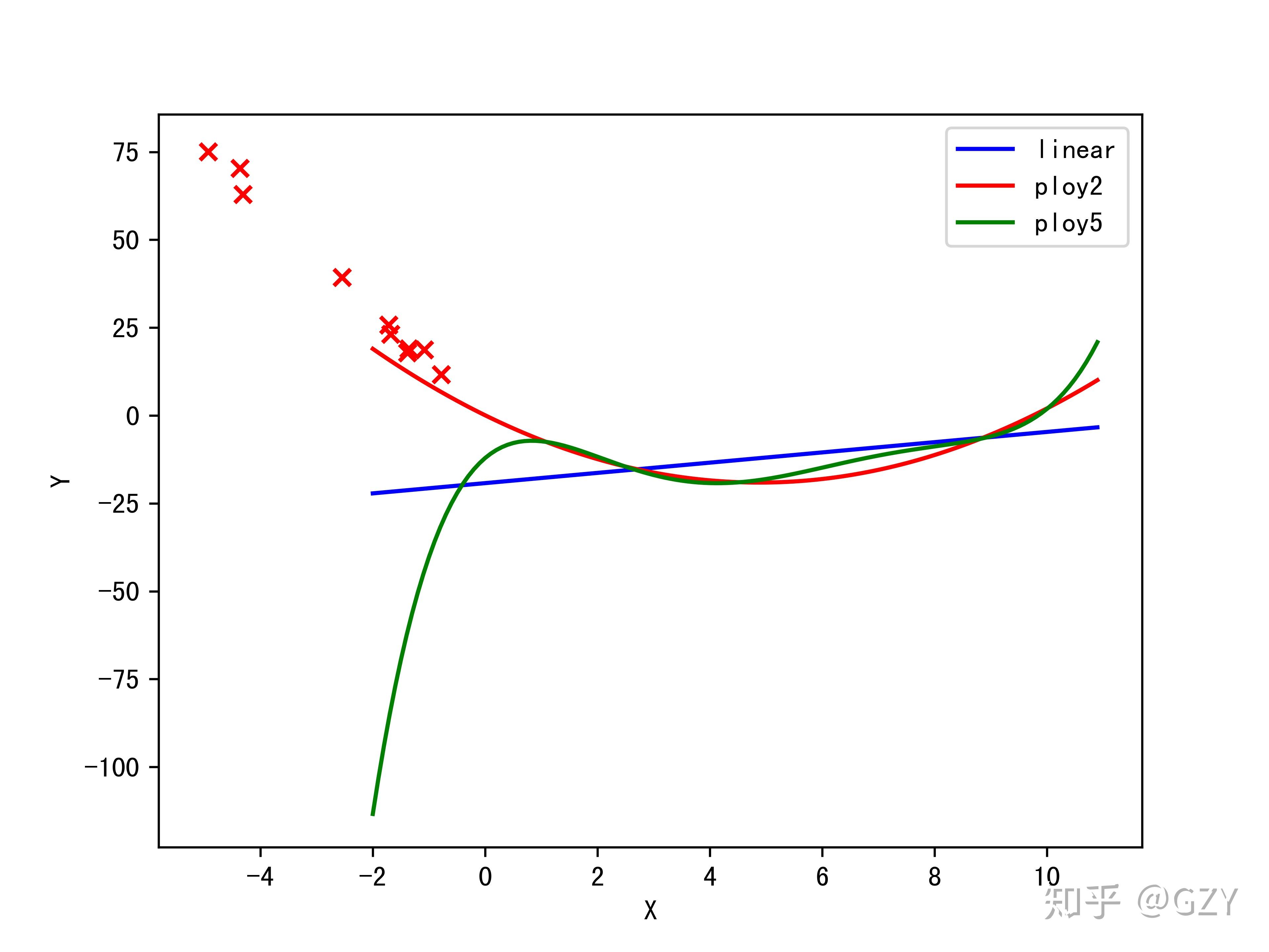 如上图所示,我们发现5次项模型已经完全偏离了测试数据点的轨迹,比1次模型的拟合结果更差,而2次模型还是能够较好的拟合。这个结果说明5次模型结构过于复杂,以致于无法良好地拟合其他数据的结果,出现了过拟合的现象。