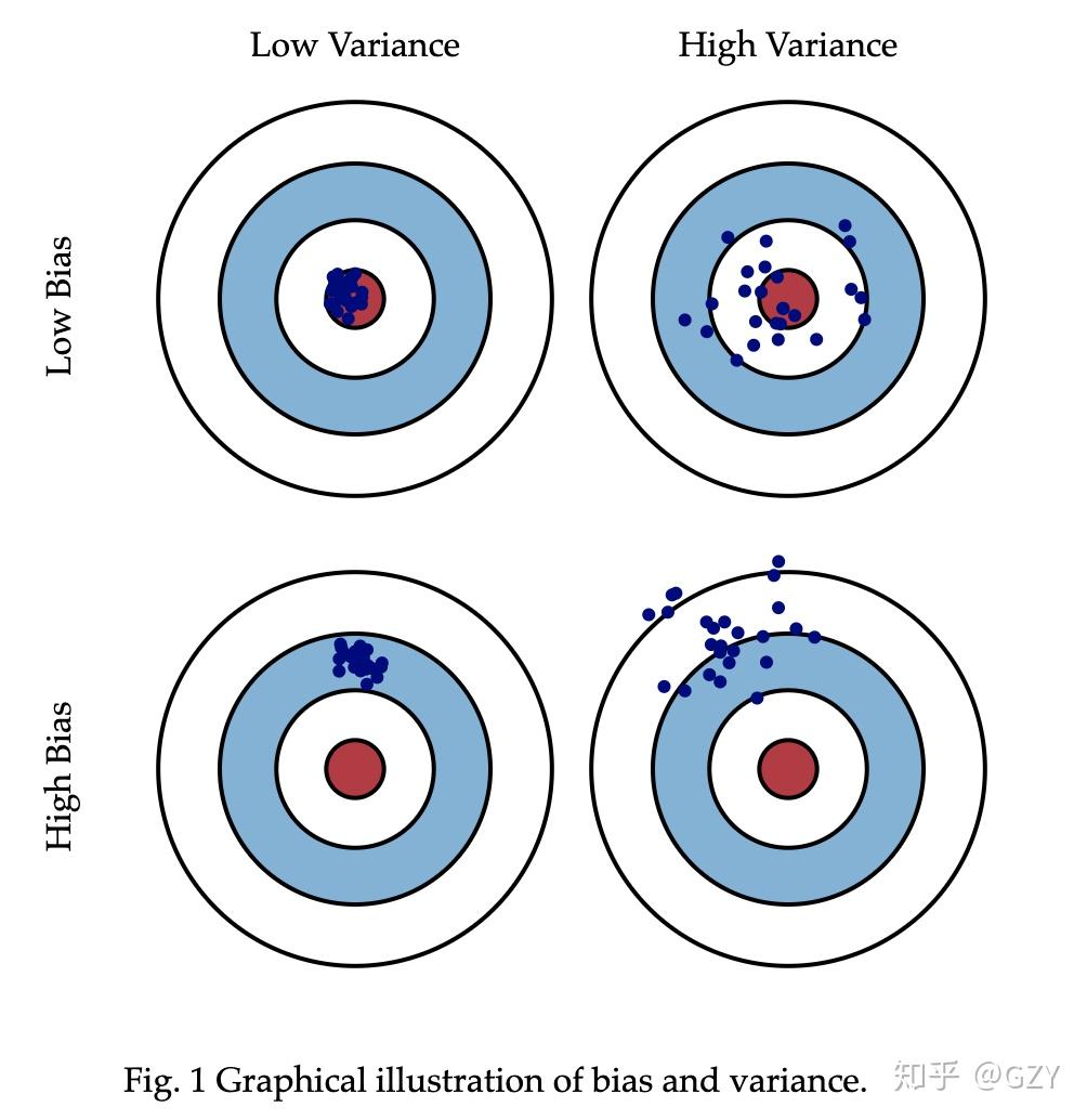 左上图是理想情况下,点都分布在靶心位置,即偏差和方差都很小。右上图点都分布在靶心的周围,因此偏差较小,但这些点较于分散,则方差较大。左下图点分布集中,说明方差较小,但距离靶心远,所以偏差较大。右下是最坏的情况,点全部分散在靶的外围,且不集中,故偏差和方差都大。