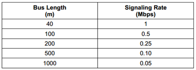 因为传输距离越大,信号时延也越大,为了保证消息的正确采样,总线上的信号速率相应也要下降。下图是推荐的信号速率与距离的关系。