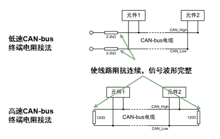 高速CAN总线最高信号传输速率为1Mbps,支持最长距离40m。ISO11898-2要求在高速CAN总线两段安装端接电阻RL(端接电阻一般为120Ω,因为电缆的特性阻抗为120 Ω,为了模拟无限远的传输线。)以消除反射。低速CAN最高速度只有125Kbps,所以ISO11898-3没有端接要求。