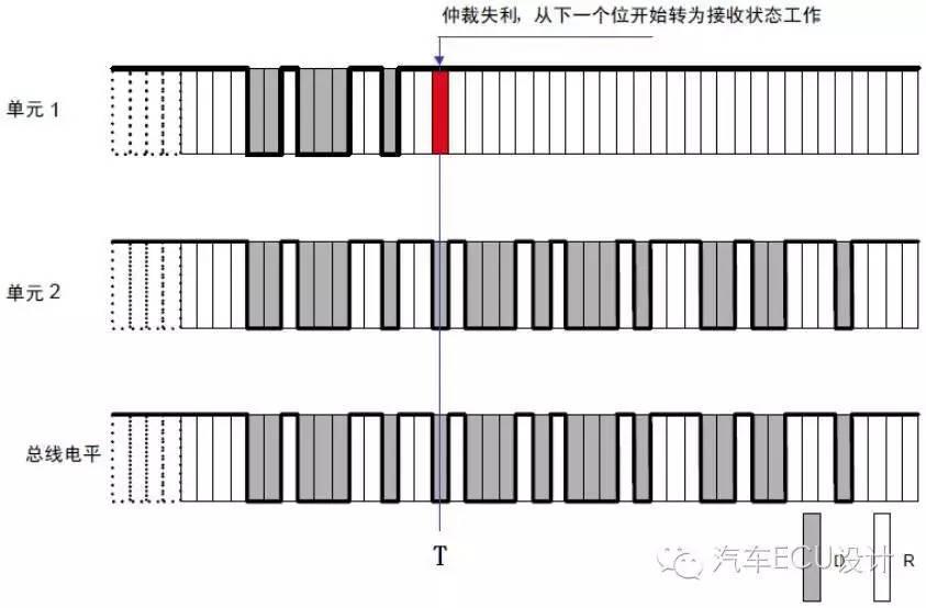 如上图,ECU单元1和ECU单元2同时开始向总线发送数据,开始部分他们的数据格式是一样的,故无法区分优先级,直到T时刻,单元1输出隐性电平,而单元2输出显性电平,此时单元1仲裁失利,立刻转入接收状态工作,不再与单元2竞争,而单元2则顺利获得总线使用权,继续发送自己的数据。