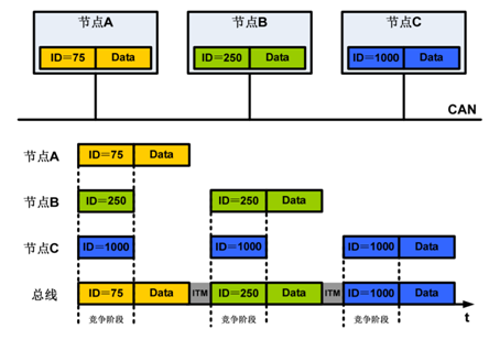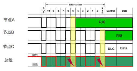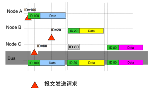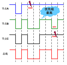 Detection + Arbitration on Message Priority)指的是如果多个节点往总线上发送消息时,具备最高优先级的消息获得总线。