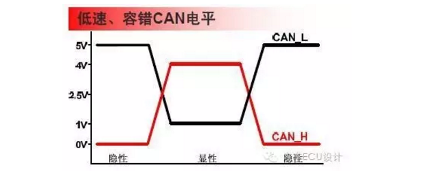 低速CAN在传输隐性状态位时,CAN_H上的电平为0V,CAN_L上的电平位5V。在传输显性状态位时,CAN_H上的电平位3.6V,CAN_L的位1.4V。