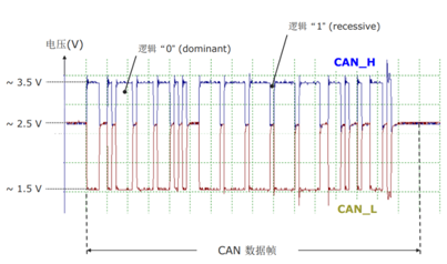 高速CAN在传输隐性位时,CAN_H与CAN_L上的电平位均为2.5V;在传输显性位时分别为3.5V与1.5V。