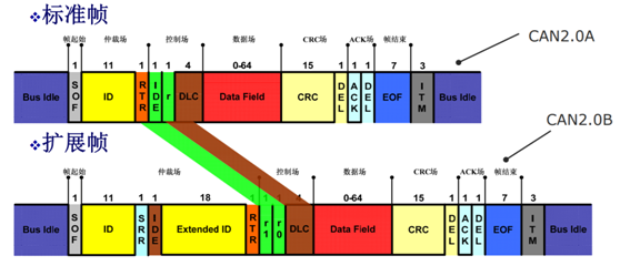 仲裁的主要是定义了报文的标识符,也俗称ID。在CAN2.0A规范中,标识符为11位,而在CAN2.0B中变为了29位。这意味着在2.0B中可以存在更多不同类型的报文,但是也降低了总线的利用率。