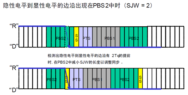 第二种,节点从总线的边沿跳变中,检测到它的时序相对超前2Tq,这时控制器在前一个位时序中的PBS2段减少2Tq的时间长度,获得同步。