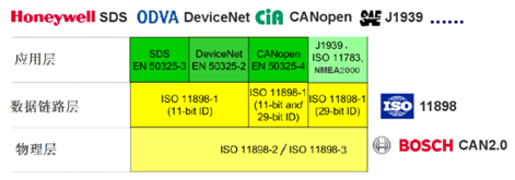 CAN总线标准之规定了物理层和数据链路层,至于应用层需要用户自定义。不同的CAN标准仅物理层不同。物理层和数据链路层:ISO11898;应用层:不同的应用领域使用不同的应用层标准。