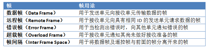 为了更有效的控制通信,CAN一共规定了5中类型的帧,帧也称为报文。