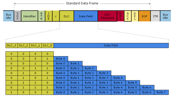 在控制段,r1(reserved1)和r0(reserved0)为保留位,默认设置为显性位。最主要的是DLC(Data Length Code)段,它是用二进制编码表示本报文中的数据段包含多少个字节。DLC段由4位组成,DLC3−DLC0,表示的数字为0-8.