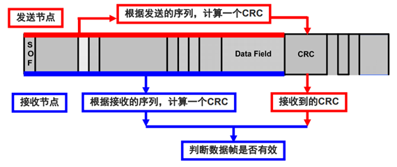 为了保证报文的正确传输,CAN的报文包含了一段15位的CRC校验码,一旦接收端计算出的CRC码跟接收到的CRC码不同,就会向发送端反馈出错信息以及重新发送。CRC部分的计算和出错处理一般由CAN控制器硬件完成,或由软件控制最大重发数。