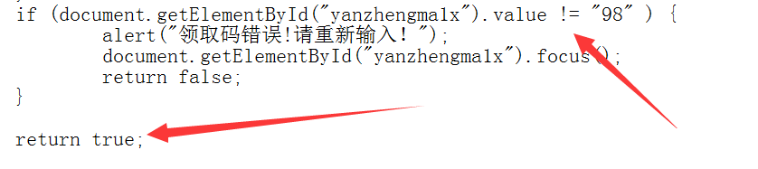 在查看源代码时,我们发现 当领取码不等于98的时候 就返回true,及领取码等于98。