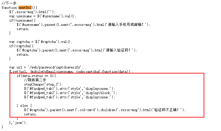 如果data.status 等于0 那么跳转第二步,如果不等于0 那么就提示验证码不正确!