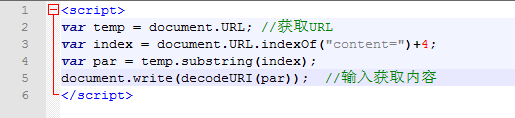上述代码的意思是获取URL中content参数的值,并且输出,如果输入http://www.xxx.com/dom.html?content=<script>alert(/xss/)</script>,就会产生XSS漏洞。