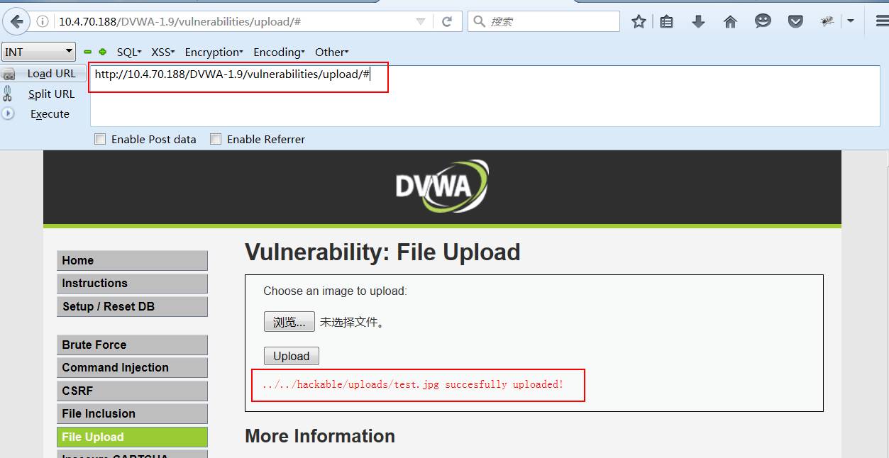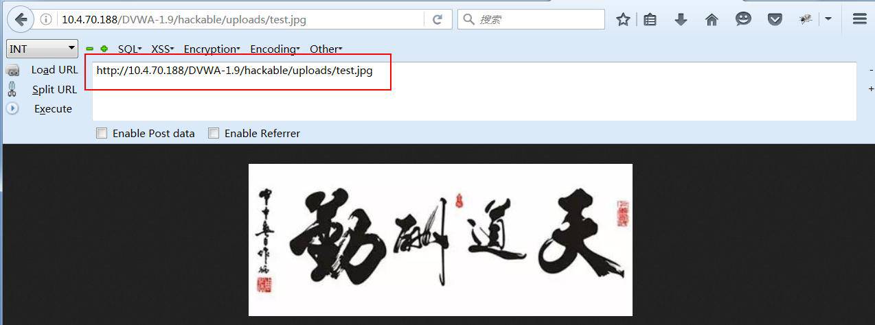 我们根据显示的路径信息,推测上传图片的地址为“http://10.4.70.188/DVWA-1.9/hackable/uploads/test.jpg”,在浏览器中打开: