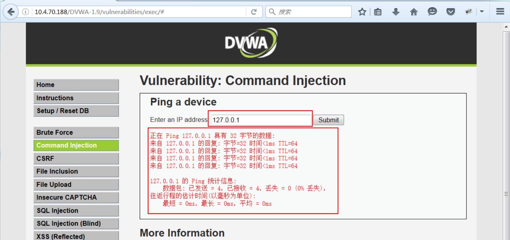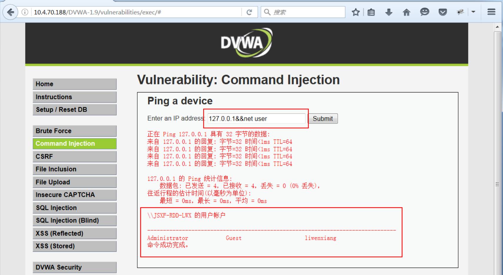结果显示不仅仅执行了 ping 127.0.0.1 操作,而且也执行了 net user 命令,我们可 以把 net user 换成其他任意命令进行攻击。