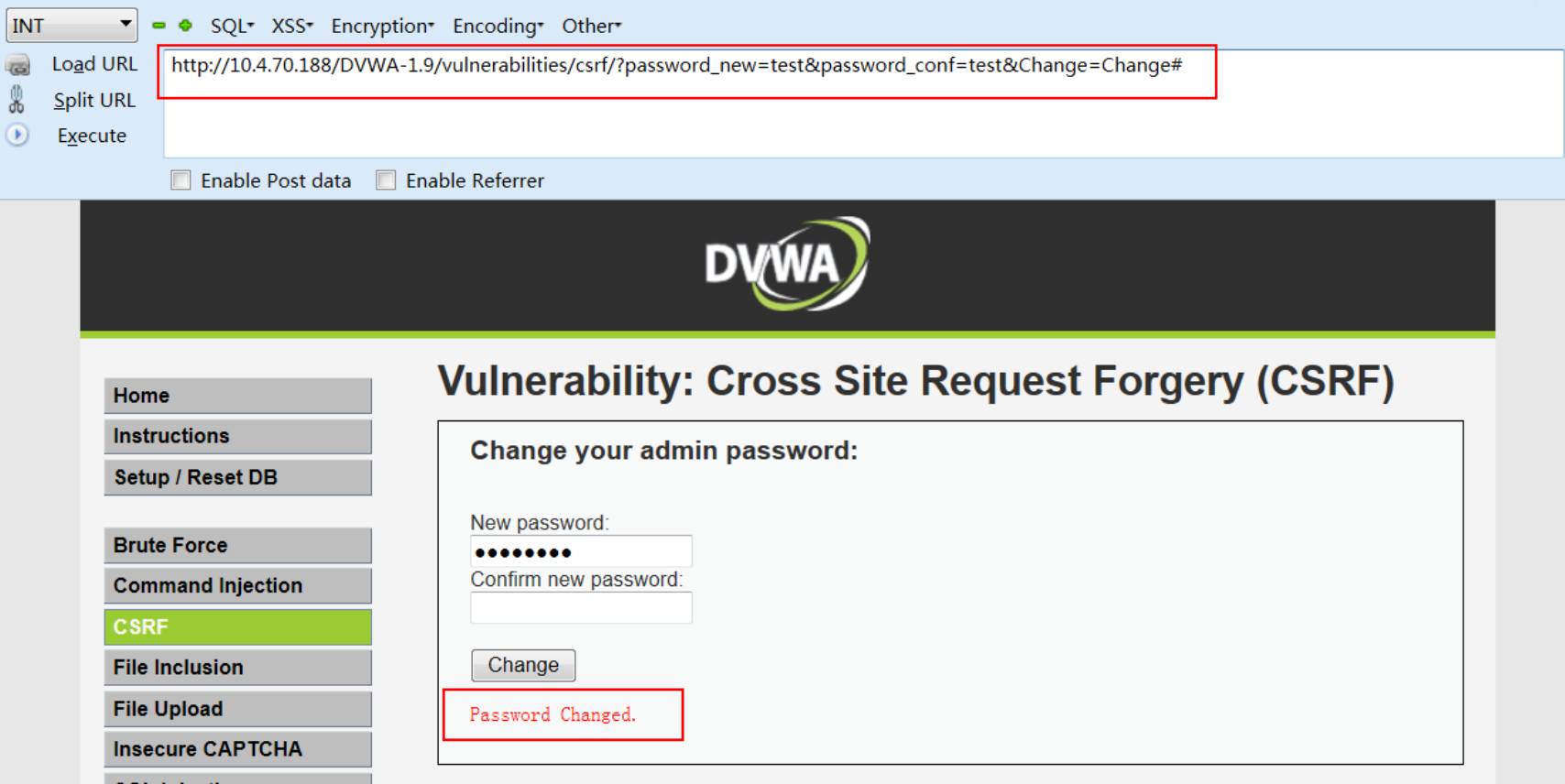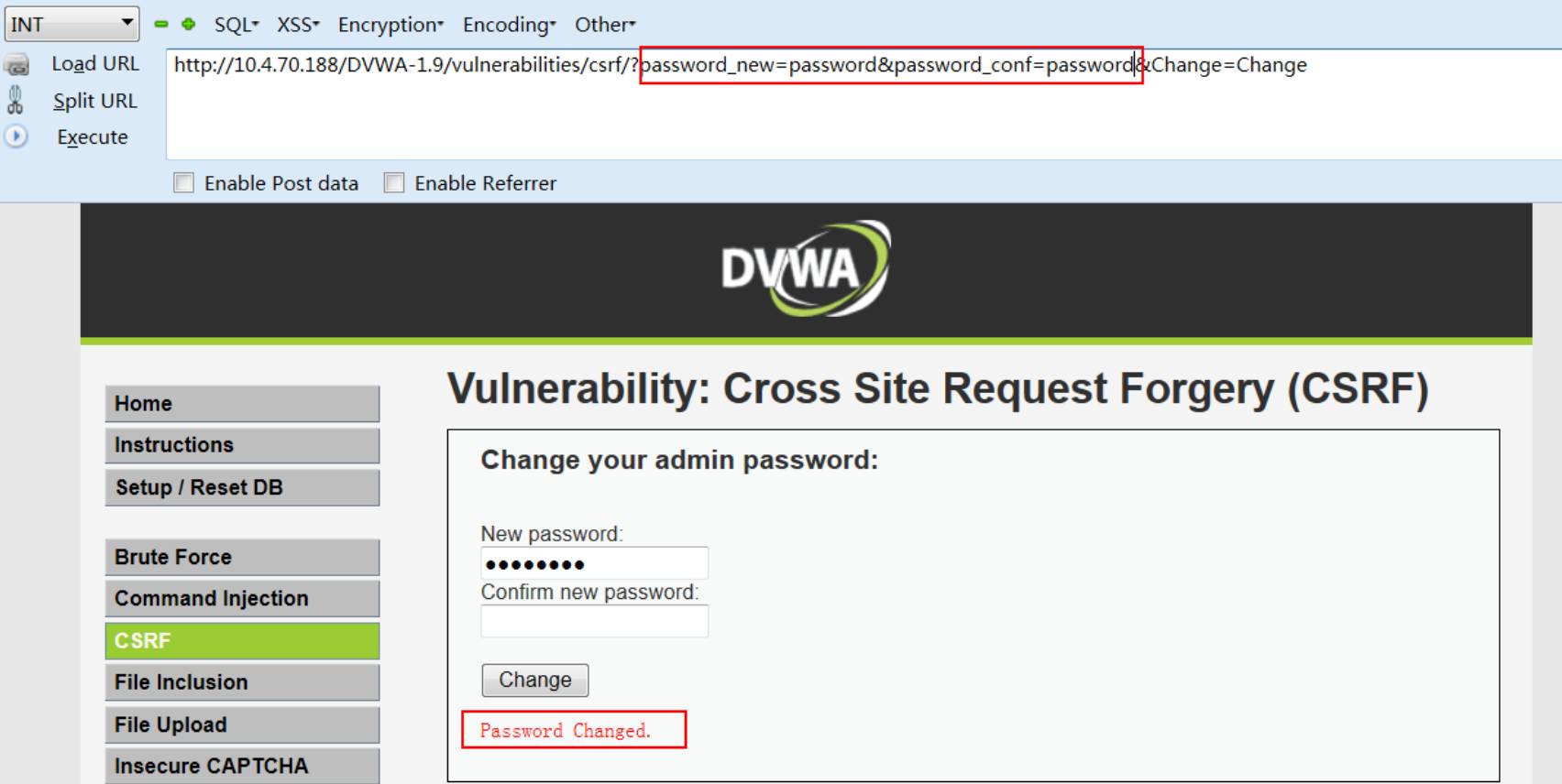我们发现,这个修改密码的请求为 “ http://10.4.70.188/DVWA-1.9/vulnerabilities/csrf/?password_new=test&password_ conf=test&Change=Change ”, 此 时 , 我 们 打 开 新 的 窗 口 , 修 改 password_new=password 和 password_conf=password,访问显示如下: