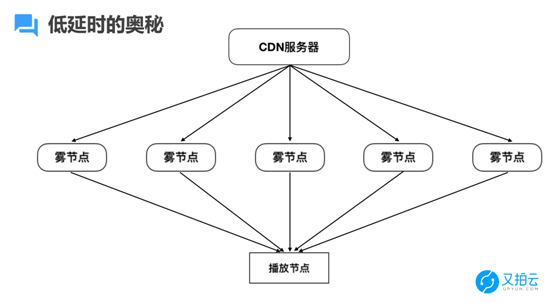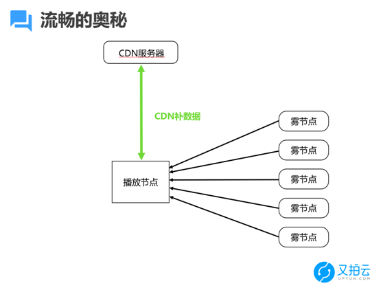 CDN 服务器几乎同时把一个数据流的 1/20 子流推到很多雾节点,雾节点同时把数据推到了播放节点。整个过程中,数据路径非常短,它只是通过雾节点同时中转一下。