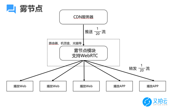 我们重点看一下“雾节点”是怎么回事。CDN 网络的边缘节点,统一看成一个 CDN 服务器。CDN 服务器会推送 1/20 的数据流到雾节点上。雾节点会和十几、二十个播放端相连,直接把这 1/20 数据流转发到各个播放端。
