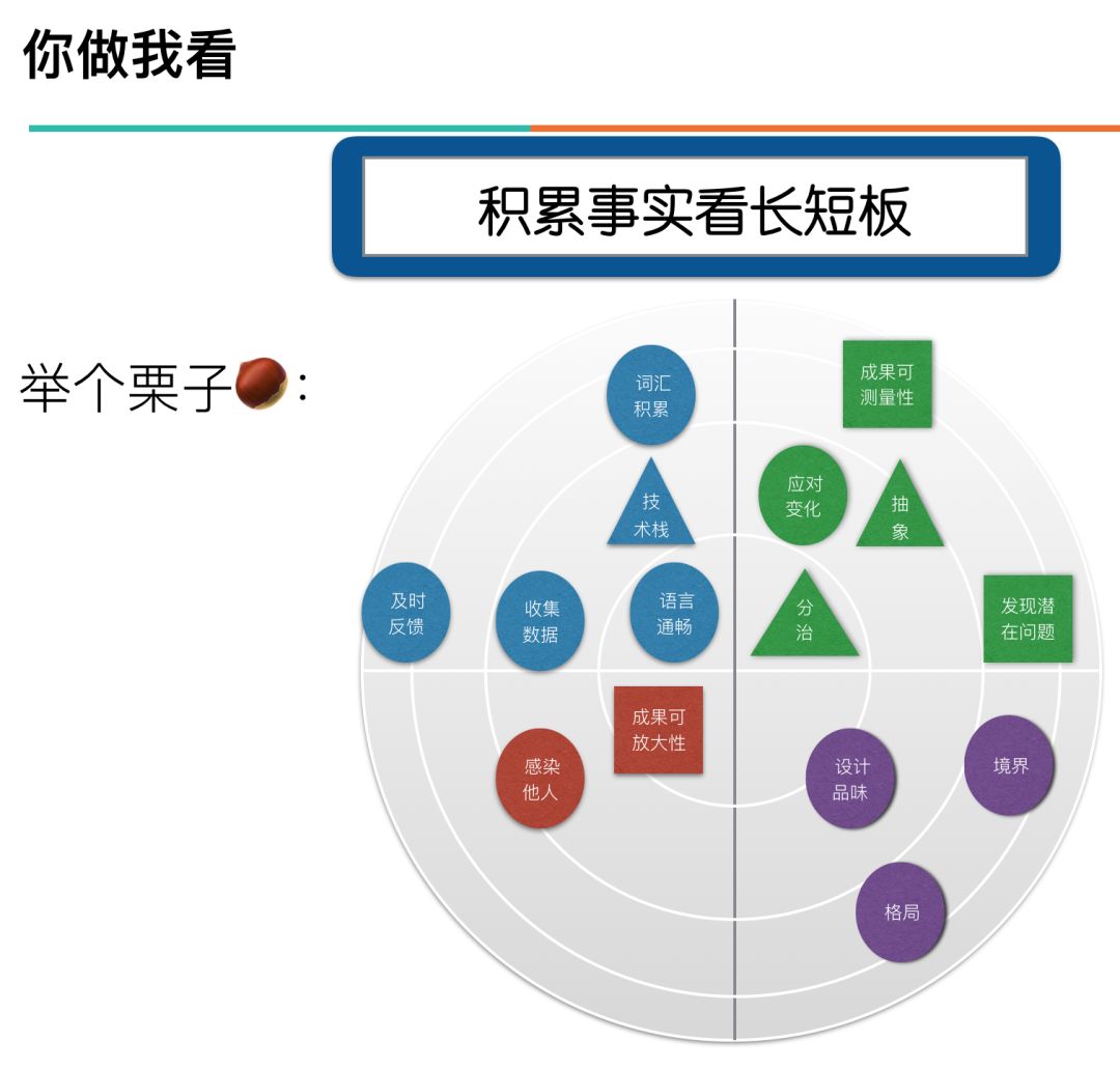 这里“积累事实看长短板”我用的是thoughtworks的技术雷达来呈现。四个象限代表四个层次的东西。第一象限的最为基础。从圈里到圈外代表的是做的人做的程度。一个个小形状是从时间维度来看变化的,圆形代表一直如此,三角形代表近期增强,正方形代表近期减弱。