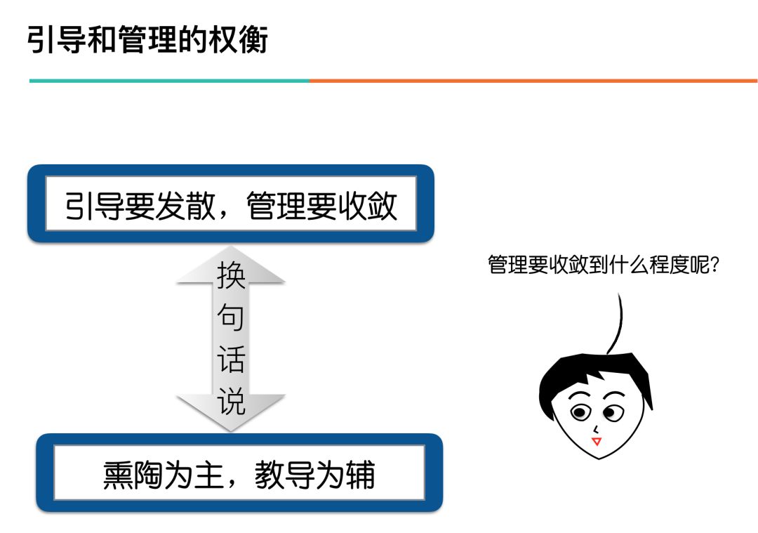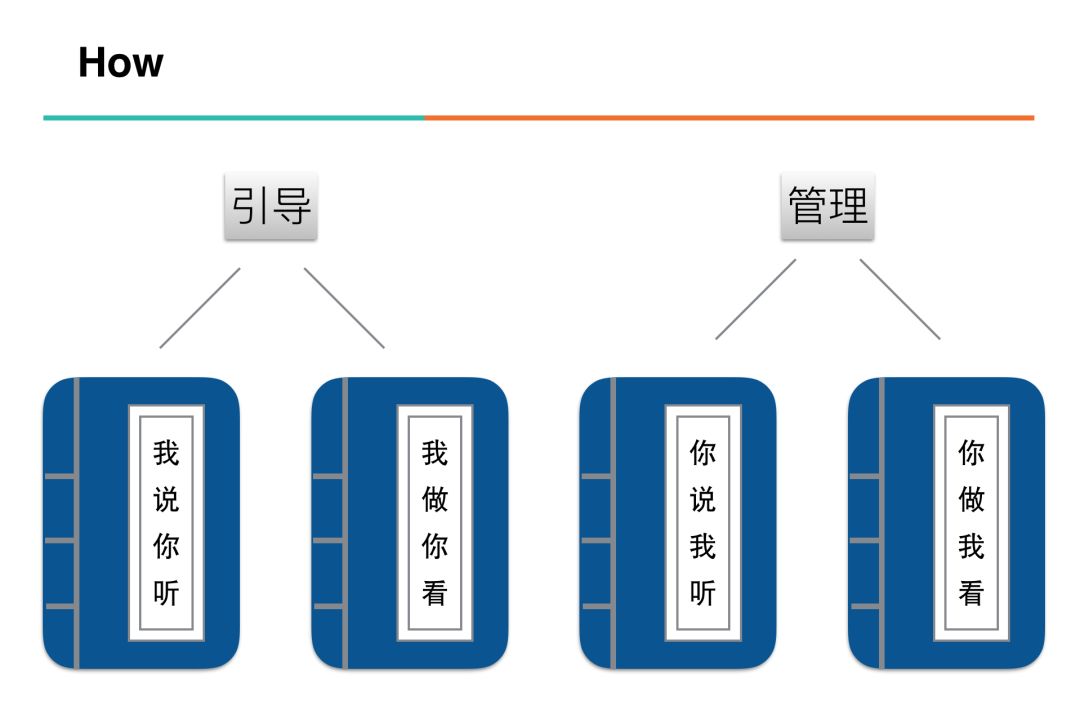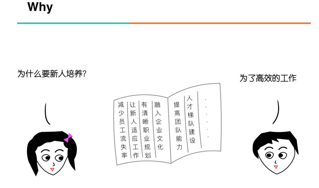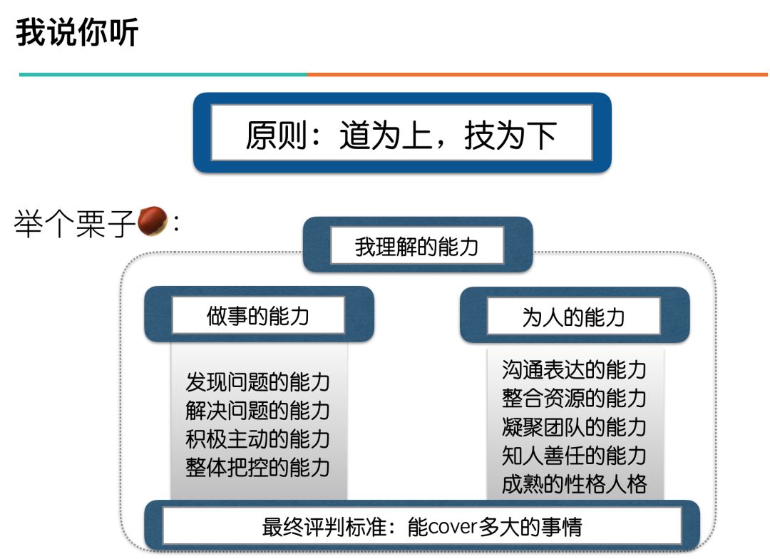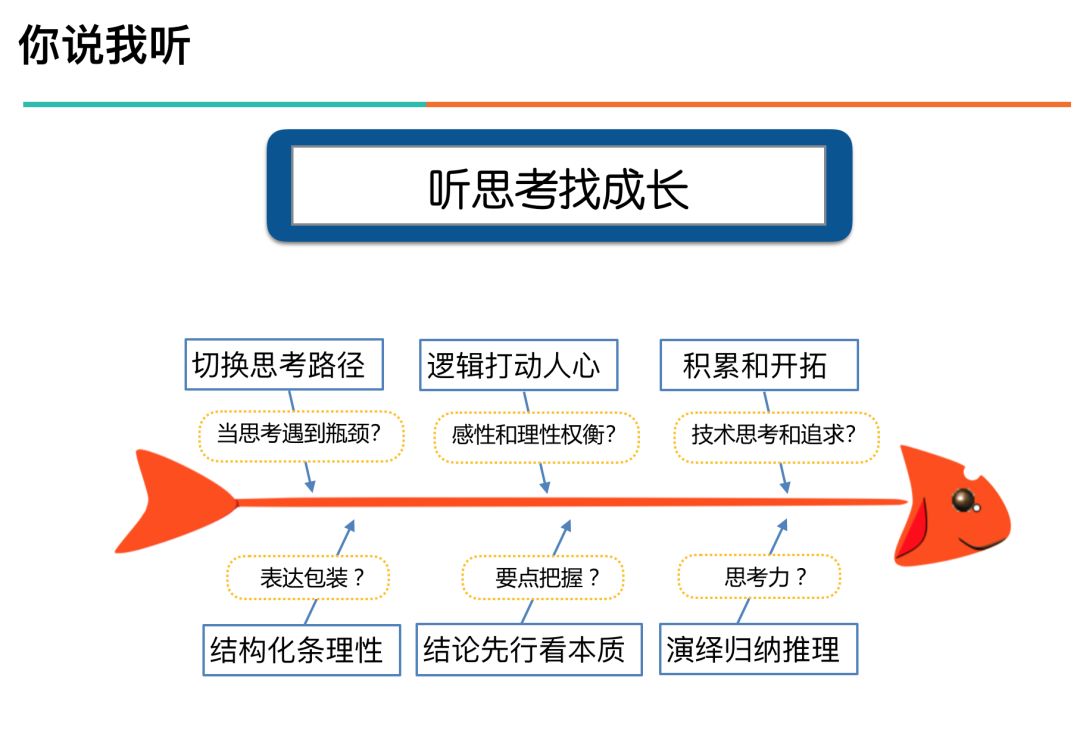 在上面how来“引导”的PPT页面呈现是采用罗列式,主要想给出引导的发散空间。这里“听思考找成长”更多是一种分析方法,所以这里采用鱼骨图分析来呈现。