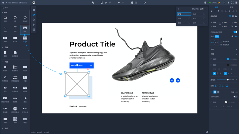 - 自带交互效果的预设组件、海量图标、便捷的编辑方式,快速产出设计。