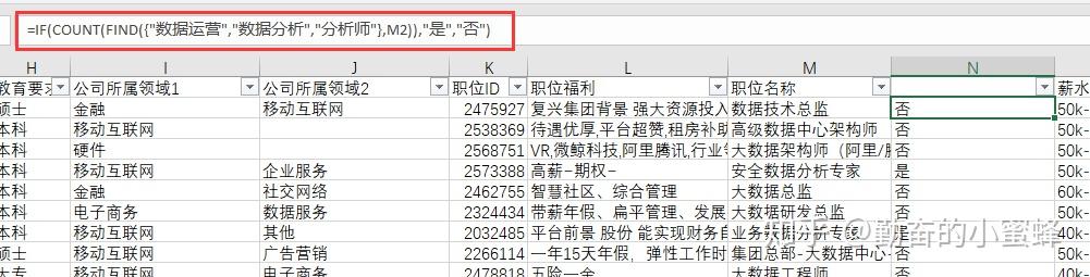 计算公式:=IF(COUNT(FIND({"数据运营","数据分析","分析师"},M2)),"是","否")