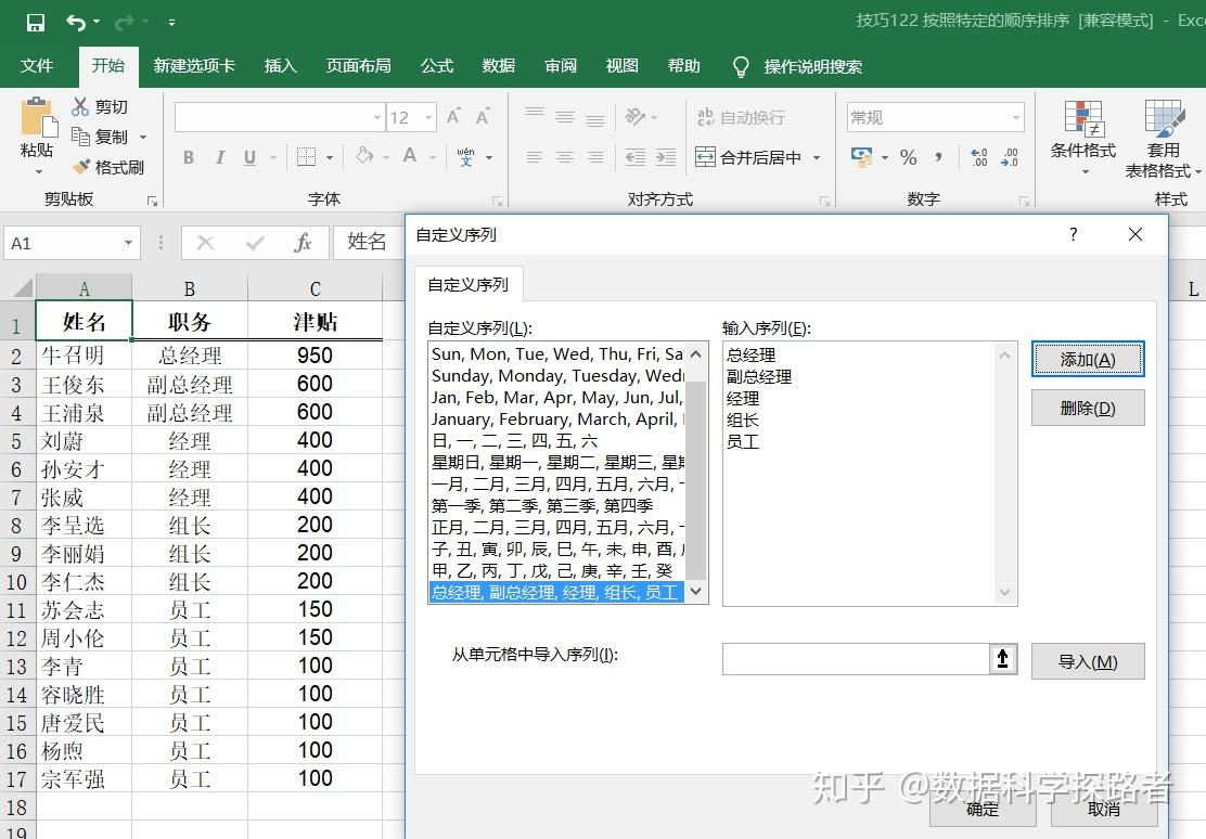 特定顺序排序(文件—选项—高级—编辑自定义列表)