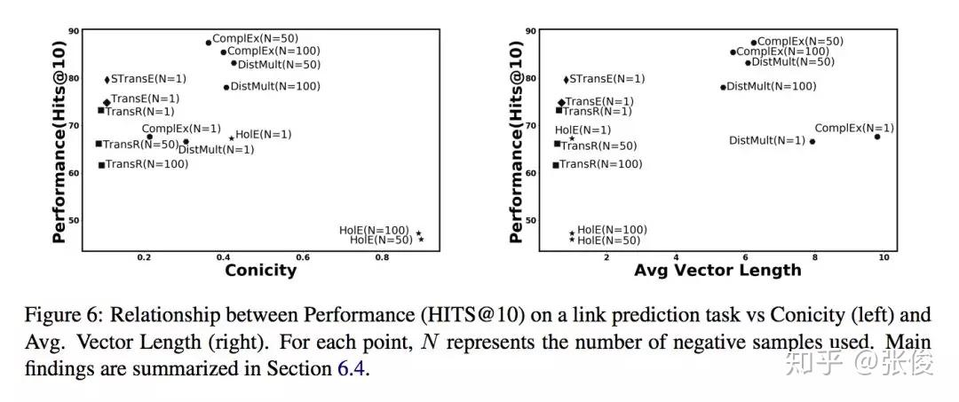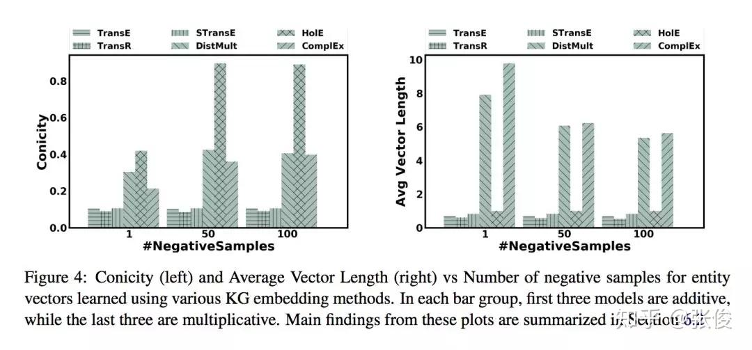 在平均向量长度方面,对于除 HolE 之外的乘法模型而言,当反例数量一定时,平均向量长度越大性能越好;而对于加法模型和 HolE 而言,平均向量长度与性能的关系并不显著,这个现象是由于这些方法使用单位向量长度来限制嵌入向量所导致的。