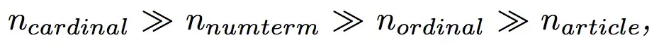 对于各种类型的计数术语,由 Table 4. 的实验结果可知,考虑数值项和冠词有利于改善覆盖率,考虑组合计数信息以及除基数词之外的其它类型术语,有利于提高准确性和覆盖率。