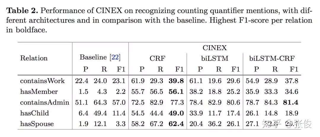 从 Table 2. 可知,计数量词的识别基于特征的 CRF 模型效果最好,神经网络模型容易过拟合。同时,CINEX-CRF 也是在整合和端到端任务中识别计数信息性能最佳的系统。