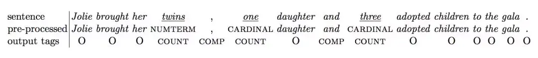 给定句子“Jolie brought her twins , one daughter and three adoptedchildren to the gala”,计数量词识别阶段预处理以及序列标注的结果如下: