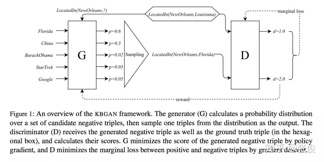 最后通过模型图我们发现论文使用 softmax 概率模型为生成器 G,通过概率分布进行采样;判别器部分 D 接收生成的负样本和 ground truth triple 并计算分数;G 通过梯度策略最小化生成的负三元组的分数,D 通过梯度下降最小化正样本和负样本的边缘损失。