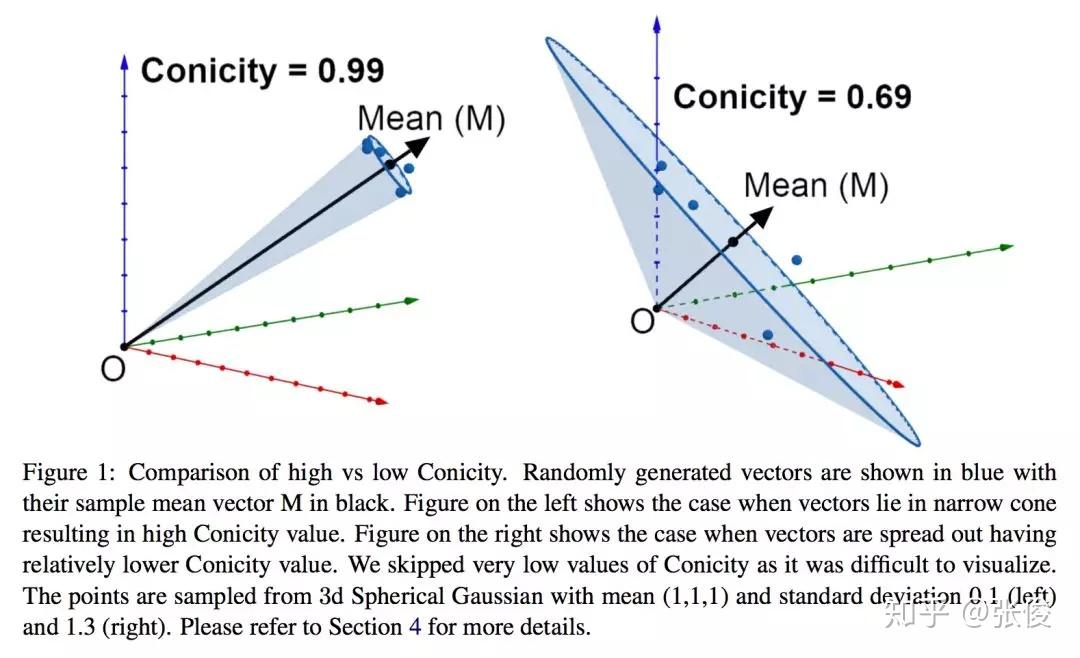图 1 给出了一个实例来帮助理解这几个指标,图中是一个三维坐标系(展示的点是随机生成的),左图表示的是高锥度(conicity)和低向量分散度(VS)的情形,而右图表示的是低锥度和高向量分散度的情形。