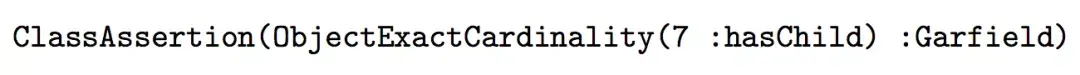 计数语句的形式化表示为 <S, P, ∃n>,其中,S 是 subject,P 是 predicate,n 是一个自然数(包括 0)。例如,语句 “President Garfield has 7 children” 将表示成 <Garfield, hasChild,∃7>。在 OWL 描述逻辑中,上述语句的形式化描述如下:
