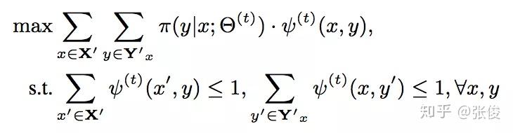 本方法的目的是最大化对齐似然,并符合 1 对 1 的对齐约束,在这种设定下,对于一组实体对齐 (x, y),y 被视为是 x 的标签(我个人是这样理解的)。故该问题建模为以下形式: