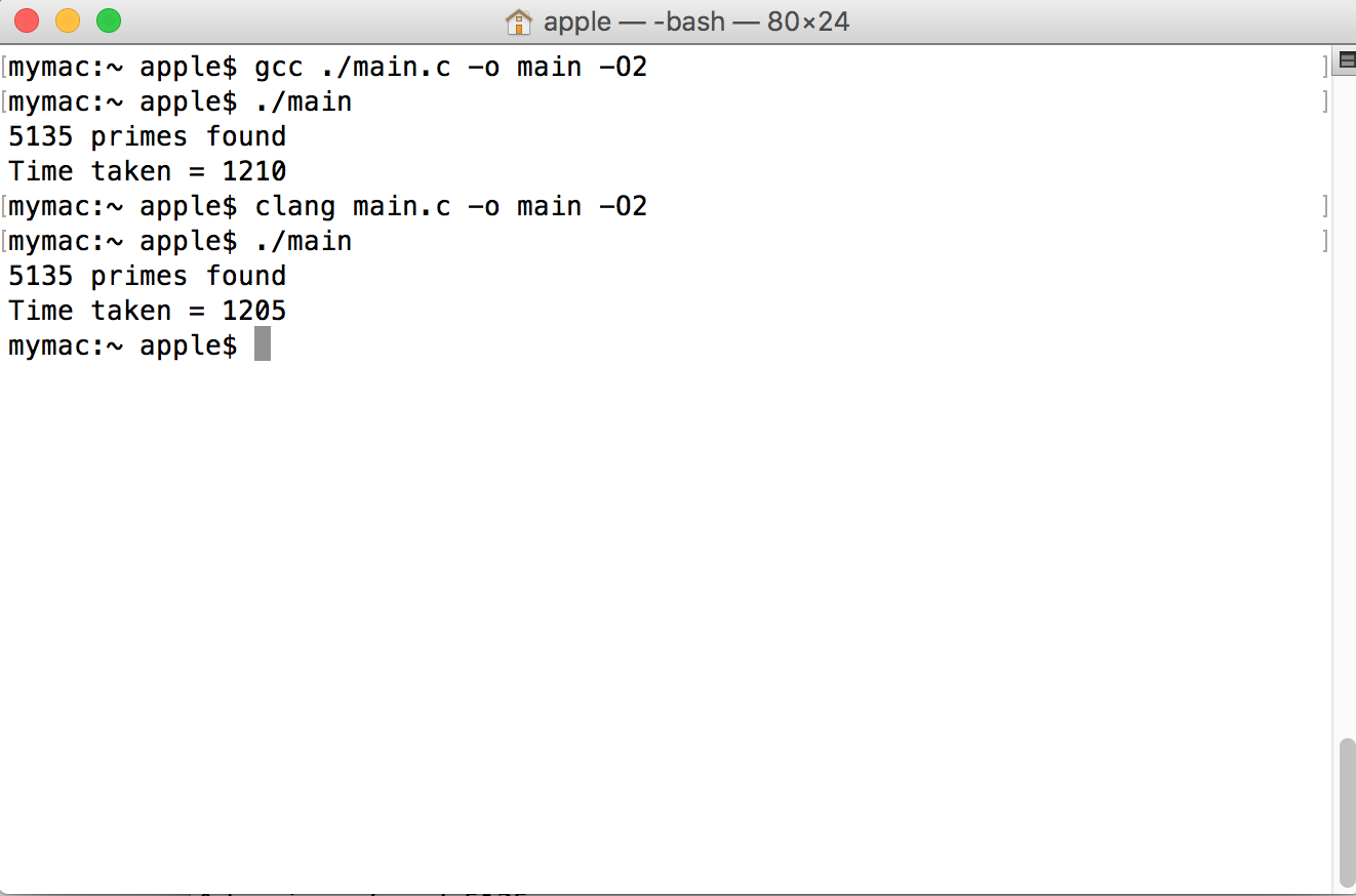 c语言打开-O2二级优化,用llvm和gcc,速度差不多都在1.2秒,clang要快点