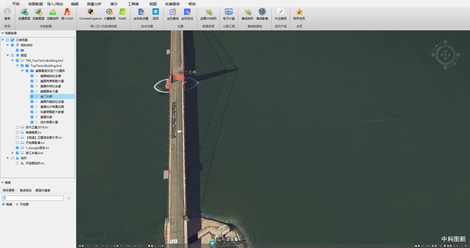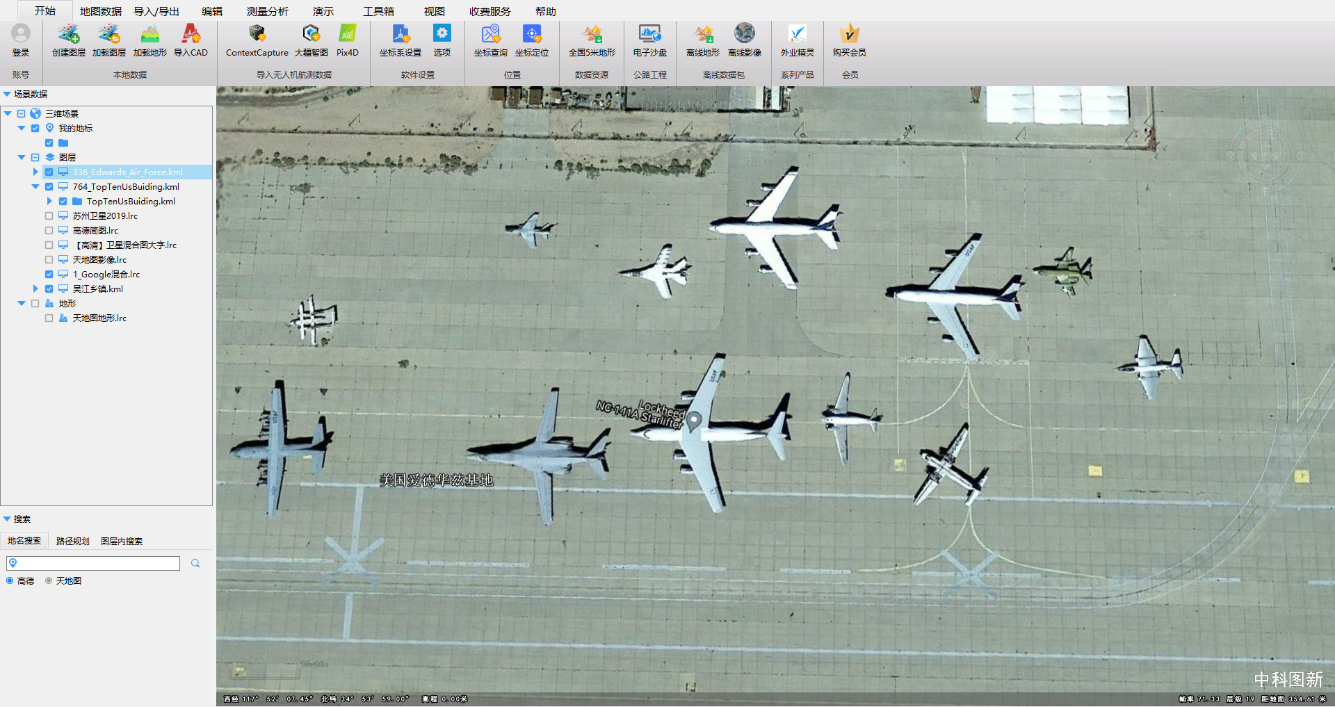这款软件能同时处理多种来源的数据,包括电子地图、三维地形图、航拍影像图、三维模型等。与Google Earth不同的是,图新地球还载有矢量数据,如地理边界、铁路、公路和飞机航线等信息。目前,图新地球软件已相当的成熟。