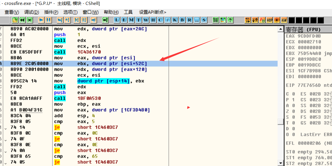 经多次下段测试,[ESI+52C]为 类似于“动作间隔”的值,开枪射速与其相关,赋值给ebx。