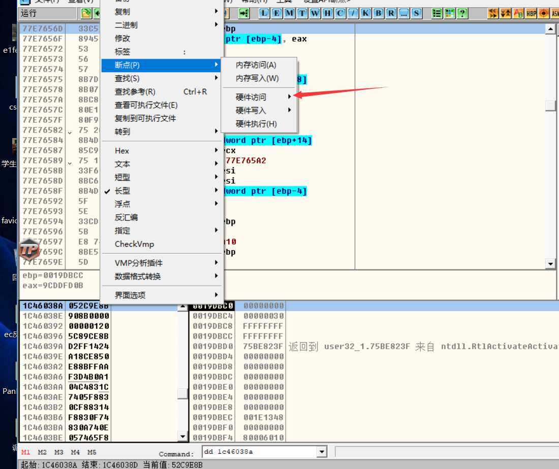 经过反复塞选,得出一个与“开枪动作时间”相关的地址,从理论上来讲,只要是与开枪动作相关的地址,都有可能断到相关的逻辑代码段。得到地址后,去DO中以DWORD的形式访问,下断后进行开枪使其断下,得到以下代码段